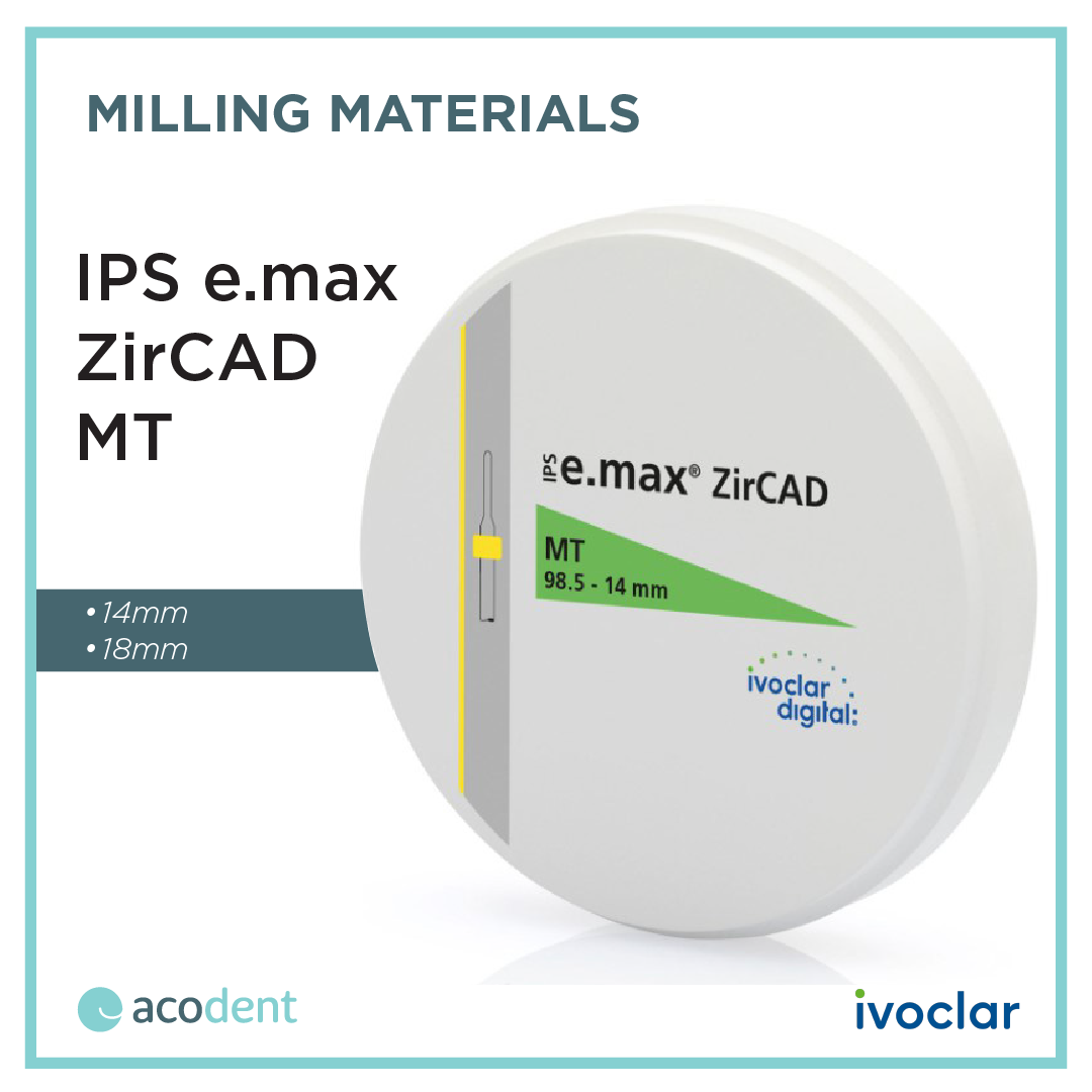 IPS e.max ZirCAD MT is the creative one in the portfolio. The material combines sound mechanical stability (850 MPa)2 with impressive esthetic properties as a result of an optimized raw material mixture. It lends itself to various processing options and offers a high degree of flexibility. The A–D shade system enables an efficient fabrication of esthetic monolithic or layered restorations. The A–D Colouring and Effect Colouring Liquids are designed for maximum customization prior to sintering. IPS e.max ZirCAD MT is available as a disc with a diameter of 98.5 mm.