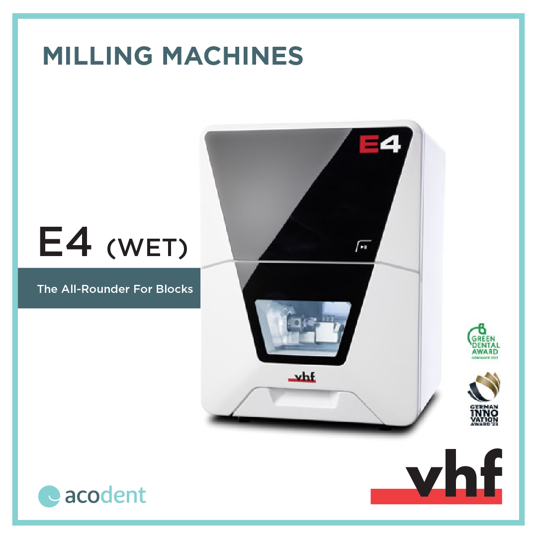 VHF E4-Wet: block milling for everyoneFor an easy start in chairside fabrication.The all-rounder for blocks!• 4-axis | 1 block | 7 air-tools• No compressed air required• Easy to get started• Maximum freedom